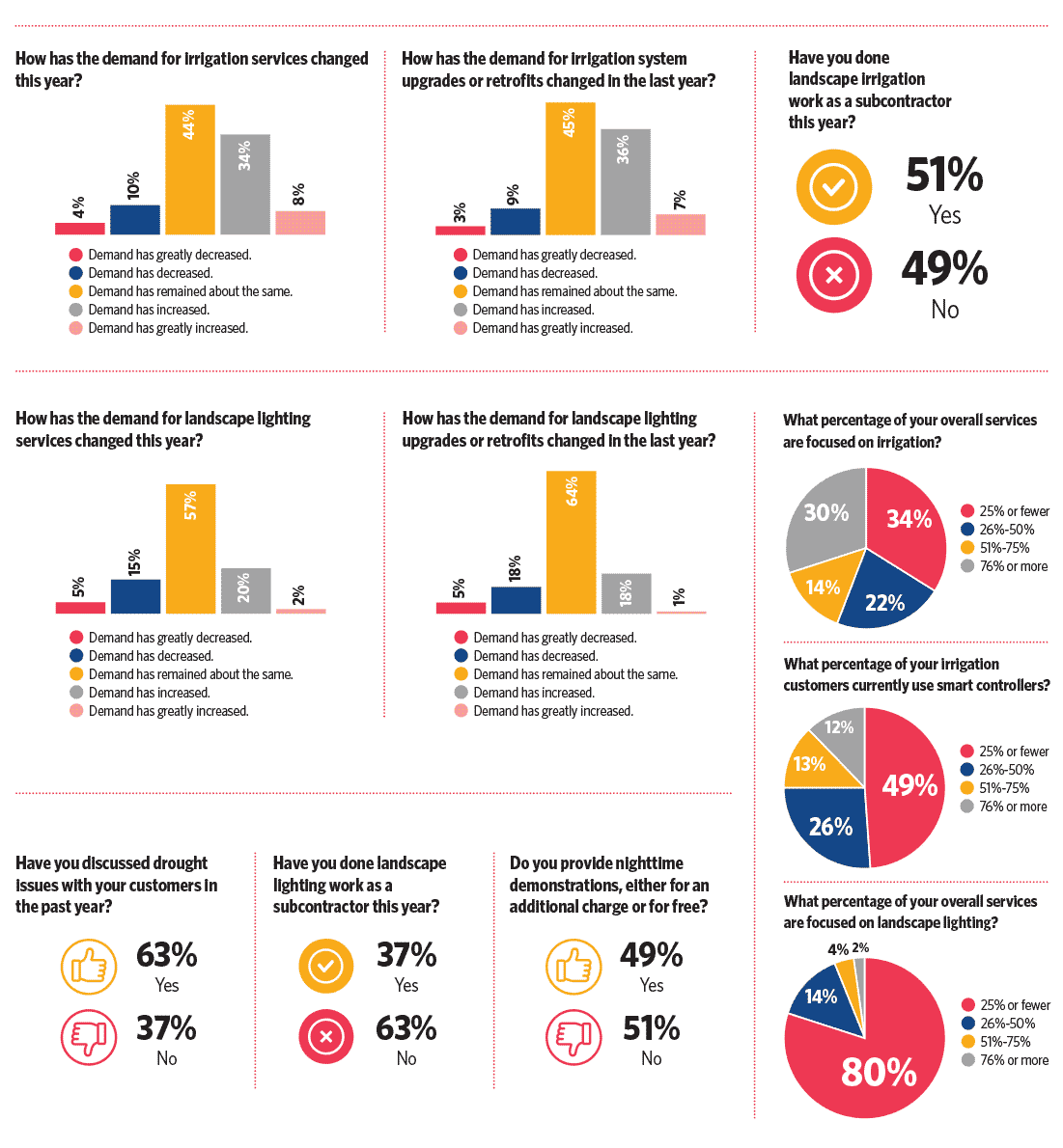 Next, we’re continuing to add more specific questions for both irrigation and landscape lighting professionals. These help develop a picture of what each of these market segments look like compared to the wider market. Whether a contractor specializes in irrigation or landscape lighting, or just provides them as one of their offered services, these results will help shape their outlook on the market for the upcoming year.