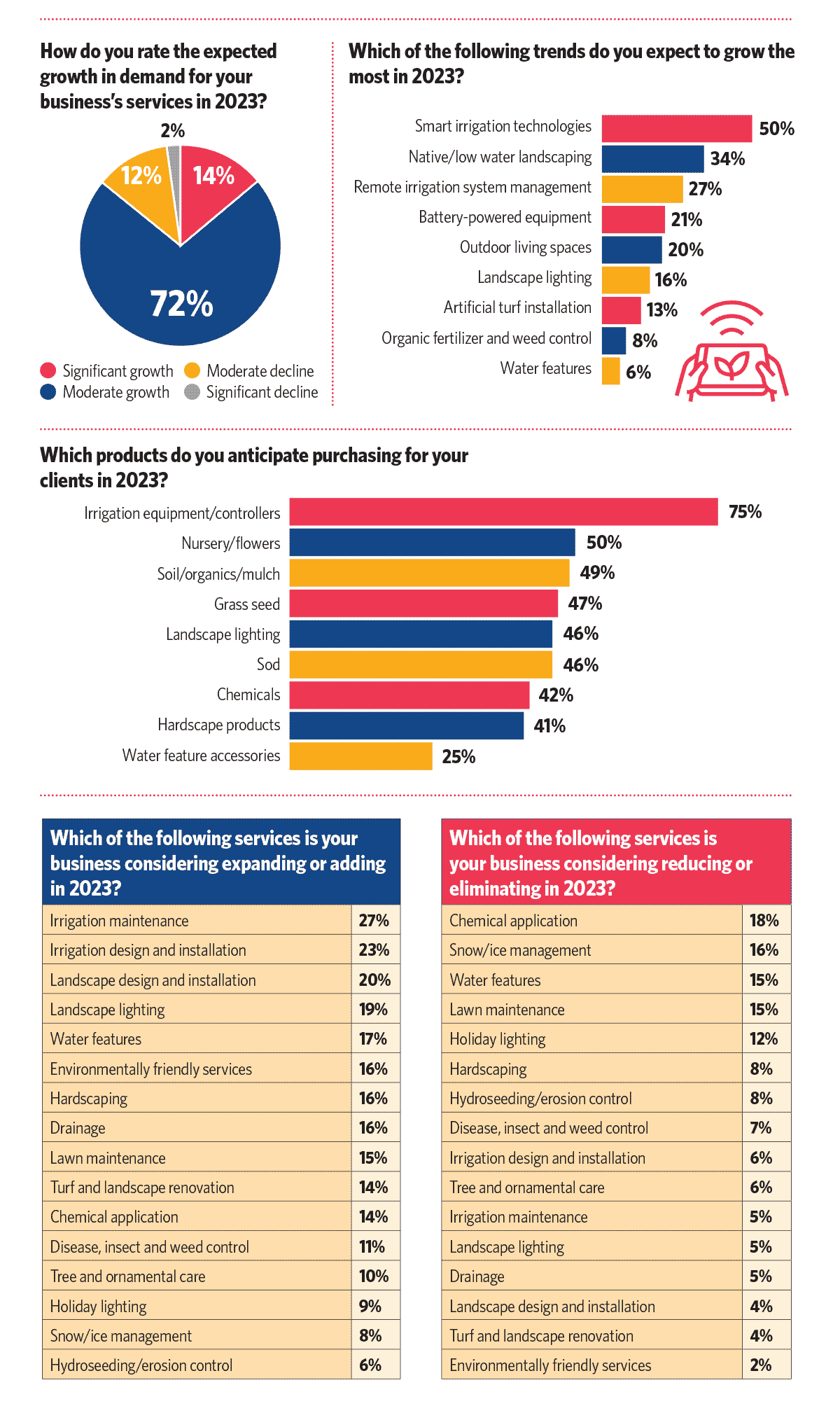 Our survey followed readers as they worked to get everything they could out of a busy market despite any one of many possible constraints. It tracked continued change to demographic and labor trends such as minimum job costs, crew compensation and enhanced business expectations, while dealing with supply chain issues. It covered huge legislative and weather impacts that were fully out of any contractors’ hands, such as increased drought restrictions in California and Hurricane Ian’s impact on the East Coast.