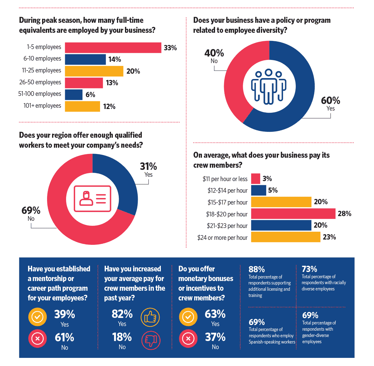 Breaking out survey responses regarding labor, some additional trends appear related to whether or not an employer reports being able to find enough workers. For the second year running, employers who report being able to find enough workers tend to have a more racially and gender-diverse workforce, though the split is roughly the same. They more often have a policy or program related to developing a diverse team (68% compared to 56%). Another fairly reliable marker for whether an employer can find enough employees is whether they have a mentorship or career path plan for staff (45% compared to 37%). Both groups pay roughly the same wages for crew members and encourage additional training and licensing, making it seem more likely that what brings employees in and keeps them around is livable wages, a culture fit and the promise of a path forward. With 80% of respondents bringing in employees under the age of 30, the next reliable crew leader or operations manager could be already on the team just waiting for an experienced boss to show them how to make the most of the job. Make sure they don’t head to another career opportunity that shows them more of a future.