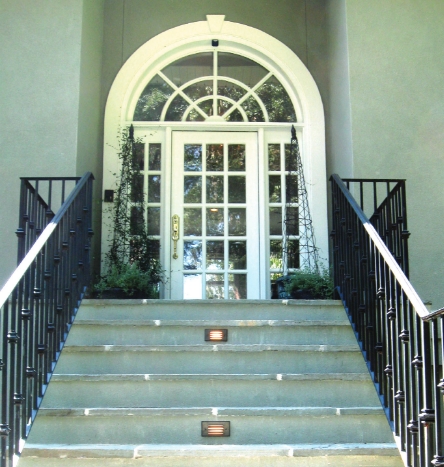 This small yet effective down lighting fixture on a stairway landing offers greater safety. Photo courtesy of Irrigation and Lighting Specialties LLC.