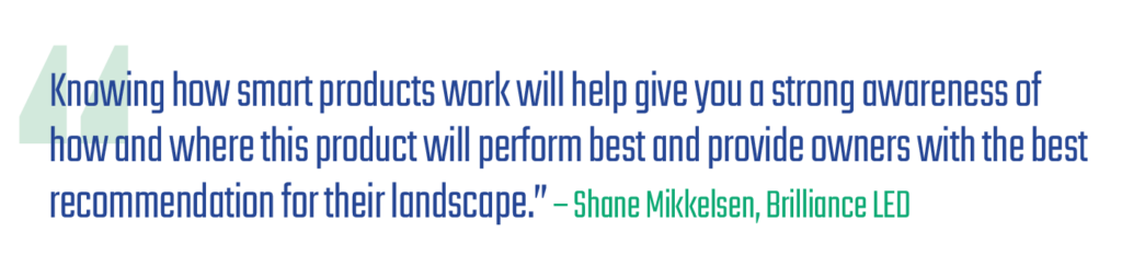 “Knowing how smart products work will help give you a strong awareness of how and where this product will perform best and provide owners with the best recommendation for their landscape,” Mikkelsen says. “… This also minimizes installation time and return calls, and it allows you time to cover how to use the product and smart app with the property owner in advance.”